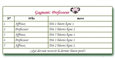 Lorsque l'un des deux prétendants gagne - ce qui est lui reste un match à l'autre, puis un message disant qui a gagné et vous demandant si vous souhaitez afficher le journal des pièces qui ont été effectuées apparaît. En effet, lorsque étant une seule partie sur la carte, le jeu se termine jeu. message de confirmation est affiché, si la presse de challenger sur le bouton OK, le programme affiche l'enregistrement joué sur une table avec toutes les pièces exécutées dans le cours du jeu.