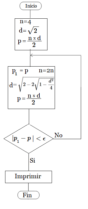 En efecto, desde la figura tenemos un círculo de radio $1$, donde el cuadrado inscrito tiene lado $\sqrt{2}$, dado que en el triangulo rectángulo $AOB$ se tiene: $$ AB^2= \underbrace{AO^2}_{1} + \underbrace{OB^2}_{1}\\ \text{ }\\ AB^2 = 2\\ \implies \\ AB = \large{\sqrt{2}}$$ Sea $\large{d = AB = \sqrt{2}}\quad$ (Las iteraciones en algoritmo, se harán en función del parámetro $\large{d}$, longitud que será la base de la siguiente cuerda o lado del polígono duplicado) Ahora, consideremos la línea $\overline {OC}$ pasando por el punto $P$. Esta línea divide en la mitad el segmento $\overline{AB}$ y permite calcular el lado $\overline {AC}$ del siguiente polígono regular de $8$ lados (primera iteración) y así sucesivamente se irá duplicando el numero de lados del polígono. Por tanto, $$ AC^2=AP^2 + CP^2 \quad \land \quad AP=\large{\left(\frac{d}{2}\right)}=\large{\left(\frac{\sqrt{2}}{2}\right)}\\ \text{ }\\ CP = OC - OP\\ \text{ }\\ CP = 1 - OP \quad \land \quad OC=1\\ \text{ }\\ OP^2 = OA^2 - AP^2,\\ \text{ }\\ \implies\\ \text{ }\\ OP^2=1-\left(\frac{\sqrt{2}}{2}\right)^2\\ \text{ }\\ OP=\sqrt{1-\left(\frac{\sqrt{2}}{2}\right)^2}\\ \text{ }\\ OP=\sqrt{1-{\frac{d^2}{4}}}\\ $$ Ahora que conocemos ambos catetos del triágulo ACP, cuya hipotenusa es el lado del polígono regular de 8 lado que se está calculado, se tiene: $$CP = 1 - OP \quad \implies \quad CP^2=1 -2·OP + OP^2 \quad \land \quad AP=\large{\frac{d}{2}}$$ Entonces, se calcula el lado $\overline{AC}\quad$ (Segmento rojo en la Figura 1): $$ AC^2=AP^2 + CP^2 \\ $$ Sustituyendo esta última expresión en función del parámetro $\large{d},\quad$ se obtiene: $$ AC^2= \left(\large{\frac{d^2}{4}}\right) + 1 - 2\sqrt{1-\left(\frac{\sqrt{2}}{2}\right)^2} + \left(1-\left(\frac{\sqrt{2}}{2}\right)^2\right)\\ \text{ }\\ AC^2=\large{\frac{d^2}{4}} + 1 + 1 -\large{\frac{d^2}{4}} + 2\sqrt{1-\frac{d^2}{4}}\\ \text{ }\\ AC^2=\require{cancel}{ \cancel{\large{\frac{d^2}{4}}} + \underbrace{ 1 + 1}_2 - \cancel{\large{\frac{d^2}{4}}} + 2\sqrt{1-\frac{d^2}{4}}}\\ \text{ }\\ AC^2= 2 - 2\sqrt{1-\frac{d^2}{4}}\\ \text{ }\\ AC=\sqrt{2 - 2\sqrt{1-\frac{d^2}{4}}} $$ A partir del valor $\overline {AC}$, que representa la longitud del lado del polígono regular (y el diámetro igual $2$), obtendremos el valor de $$ \large{\pi}\approx \frac{n \times \text{ lado del polígono}}{2} $$ Así sucesivamente, se duplica el polígono regular inscrito en la circunferencia, se calcula la nueva longitud del lado en función de $\large{d}$ y el número de lados $n$, de ese modo cada vez se obtiene una aproximación de $\large{\pi}$ más certera. Diagrama de Flujo del Algoritmo