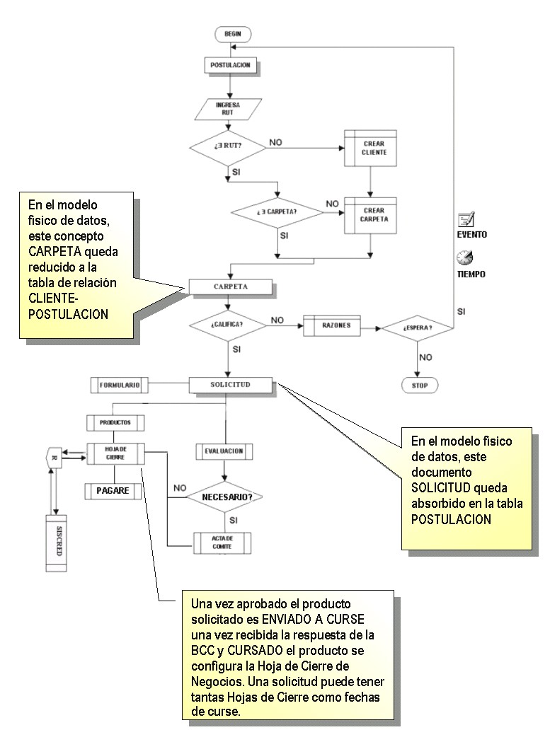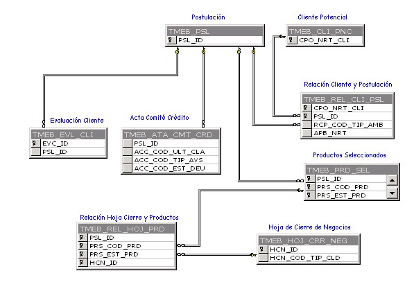 Comprensión y Comentarios Considerando el diseño de la estructura de datos: 1.- El primer paso obligado para crear una Solicitud de Producto es haber creado una Postulación, por tal motivo se utiliza el código Identificador en las tablas del Formulario Solicitud de Crédito, Acta de Comité, Evaluación Cliente (Ex Cap. de Pago) y Productos Seleccionados, quedando así subordinadas a la tabla de Postulación. 2.- La Tabla de Productos Seleccionados está relacionada con la tabla Postulación y la tabla Solicitud, debido a que se pueden seleccionar una serie de productos en Postulación que no necesariamente serán los mismos de la Solicitud, esto se controla con un campo Estado que indica si los productos provienen de la Postulacion (P) o de la Solicitud (S). 3.- Así mismo, cada producto tiene su Pagaré quedando registrados en una tabla del mismo nombre. 4.- Varios productos pueden compartir una misma Hoja Cierre de Negocios, a la que se le asigna una Fecha en común, esta relación Producto-HCN queda registrada en la tabla Productos v/s HCN, y los datos comunes quedan guardados en la tabla Hoja Cierre de Negocio.