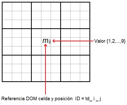 Cada fila y columna de esta matriz \(M \) generada suma 45, asi mismo cada uno de estos arreglos tiene los valores de \(D\) sin repetir valores. Luego, invocando las funciones anteriores se comienza el llenado de la matriz \(M \). Se localizan valores en la celdas utilizando las referencias ID con DOM Javascript.