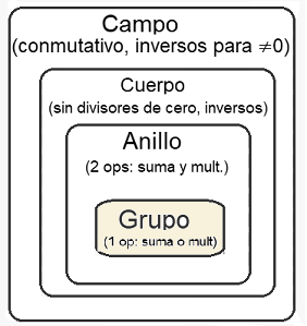 En el primer curso de Álgebra Moderna se introduce la Teoría de Conjuntos, abordando el concepto de colecciones de objetos y comenzando con los conjuntos numéricos más conocidos Naturales, Enteros, Racionales, Reales y Complejos ($\mathbb{N} \subset \mathbb{Z} \subset \mathbb{Q} \subset \mathbb{R} \subset \mathbb{C} $). ![]() Se trata de conjuntos en los cuales es posible combinar dos elementos mediante operaciones como la suma o la multiplicación, obteniendo siempre un nuevo elemento dentro del mismo conjunto. Los elementos de estos conjuntos pueden ser números, funciones u otros objetos, ya que las técnicas algebraicas aplicadas son similares. A medida que se definen una o más operaciones sobre un conjunto (como la suma o la multiplicación), surgen las llamadas estructuras algebraicas básicas, entre las que destacan los Grupos, Anillos, Cuerpos y Campos. Estas estructuras algebraicas se organizan de acuerdo con el número y tipo de operaciones definidas, y se caracterizan por cumplir ciertas propiedades fundamentales, tales como asociatividad, conmutatividad, existencia de identidad, inversos, clausura, entre otras. ![]() En general, las asignaturas introductorias de Álgebra Moderna presentan una visión inicial de estos conceptos, enfocándose particularmente en las operaciones binarias y en el estudio del concepto de Grupo mediante ejemplos simples, como las tablas modulares en el conjunto de los enteros positivos $\mathbb {Z^{+}}$. (Ver Grupo de Números Primos ~ Abeliano Cíclico de Permutaciones)
