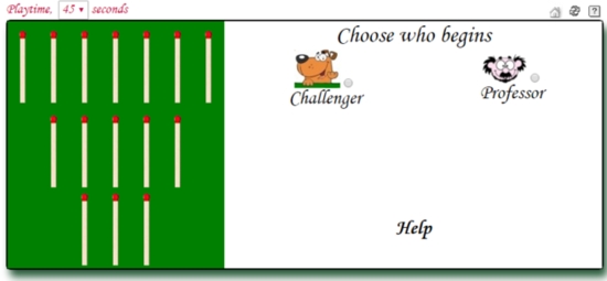 The three rows of matches arranged on the board divided into two areas. The first row has 7 sticks, five sticks the second and third 3 stalks. They are two opponents who take turns to draw matches. They are you, the Challenger represented by Boby puppy, and the other is the Professor. The rules is very simple. Each opponent takes turns to remove either matches from a row. You win if your opponent left with the last match. The game consists of removing sticks in respective form, so that the player should take the last stick loses. The rule is to get as many sticks as you want on every play, but in the same row. The game should occur in 45 seconds (the option to select 20,45 and 60 seconds is given). If you delay in responding over that time, you lose. The match is played in 3 sets that includes 5 games each one. Once completed more than 5 games and 3 sets, the application displays a message and close the session. This means that if you want to continue challenging the Professor must wait at least 5 minutes and re-enter the system. The idea of offering a limited number of games is to develop a strategy challenger and not try to win by trial and error, just looking for combinations, without a fee reasoning. The program offers the option of choosing who starts. If you press on the word Help a window with the basic instructions are displayed.