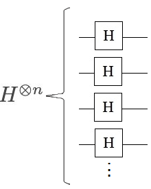 Nótese que la superposición generada tiene tremenda potencia, dado que las puertas cuánticas de Hadamard en paralelo se multiplican tensorialmente entre ellas.